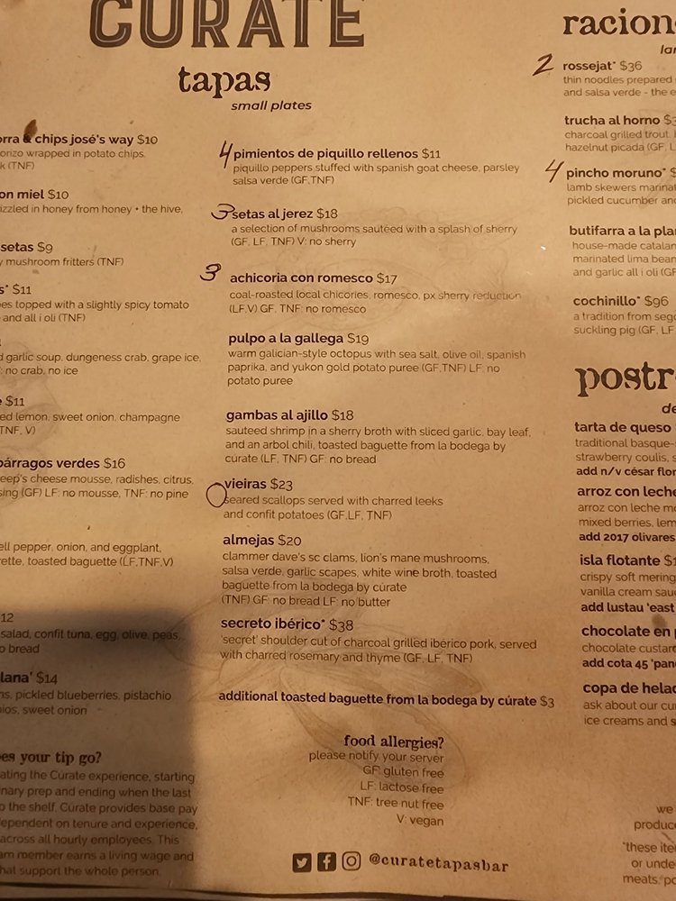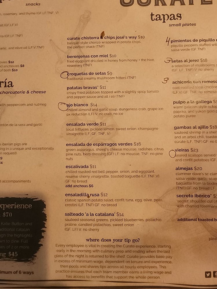 Cúrate, a Spanish wine bar and tapas restaurant located in Asheville, NC, offers a diverse and sophisticated dining experience. Boasting a range of options for pescatarians, vegans, and vegetarians, as well as accommodating those with dietary restrictions, Cúrate provides a culinary adventure for all. With a full bar, trendy ambiance, and attentive service, this restaurant is perfect for group dinners or private dining events. Customers rave about the delicious dishes, such as the ensalada de espárragos verdes, patatas bravas, and pulpo a la gallega. The menu also features standout desserts like the deconstructed lemon meringue pie and house-made sorbets. Make sure to try the seasonal soda for a refreshing choice. Reservations are highly recommended due to the popularity of this establishment.Overall, Cúrate offers a wow experience reminiscent of dining in Spain, making it a must-visit destination for food enthusiasts.